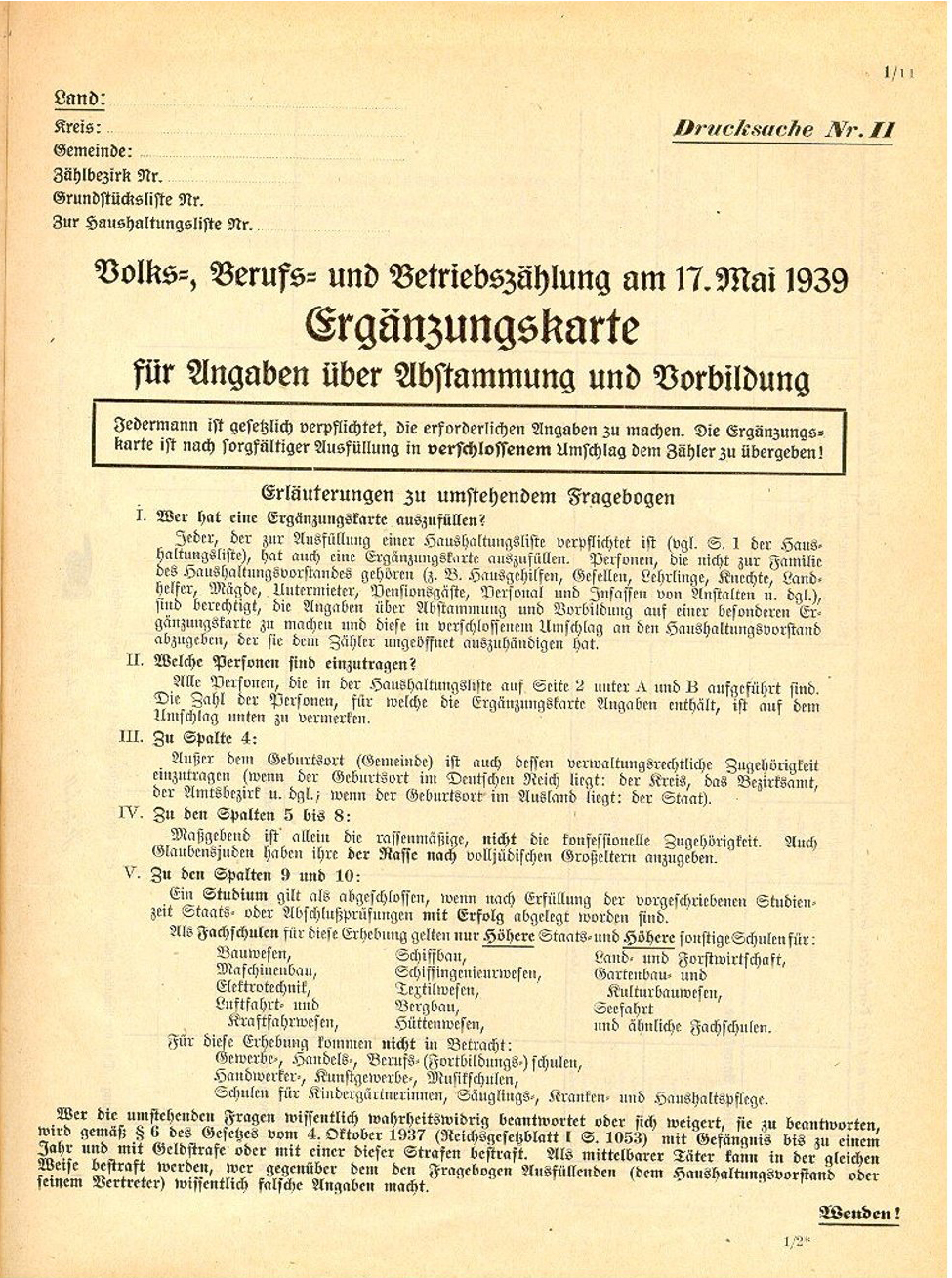 „Die Ergänzungskarten der Volks-, Berufs- und Betriebszählung am 17. Mai 1939“Im Rahmen der großen Volks-, Berufs- und Betriebszählung im Deutschen Reich vom 17. Mai 1939 musste von jedem Haushalt die Ergänzungskarte für Angaben über Abstammung und Vorbildung ausgefüllt werden. Darin wurde explizit nach der jüdischen Abstammung aller vier Großeltern eines jeden Haushaltsmitglieds gefragt. Wurde diese bejaht, wurden die Karten – nach der regulären Auswertung durch das Statistische Reichsamt – anschließend dem Reichssippenamt übergeben, das für Familienforschung und Abstammungsnachweise im Deutschen Reich zuständig war. Diese Behörde hatte ihren Sitz in der Oranienburger Straße 28–30 in Berlin, einem nach dem 9. November 1938 beschlagnahmten Gebäude der Jüdischen Gemeinde zu Berlin. Dort bewahrte das Reichssippenamt den Großteil der Ergänzungskarten der Volkszählung von 1939 auf. Die Erfassung von Personen mit einem oder mehreren jüdischen Großeltern folgte der nationalsozialistischen Ideologie und definierte eine jüdische Abstammung ausschließlich im Sinne der Nürnberger Rassengesetze. Die Angaben auf den Ergänzungskarten hatten somit keinerlei Aussagekraft über die Identität der betreffenden Personen, sondern basierten ausschließlich auf rassistischen und antisemitischen Kategorien. Sie machten eine anschließende Klassifizierung als Jude bzw. Jüdin oder auch „Mischlinge ersten oder zweiten Grades“ möglich. Diese Zuschreibungen müssen ausdrücklich als NS-spezifische Ausdrücke gekennzeichnet, sollten ausschließlich als Quellenbegriffe genutzt und entsprechend in Anführungszeichen verwendet werden. Leider sind sie bis heute im allgemeinen Sprachgebrauch zu finden und werden zum Teil noch immer vorbehaltlos verwendet.Die Ergänzungskarten sind eine wertvolle Quelle für die Familienforschung, für Angehörige, Wissenschaft und Gedenkkultur. In den Unterlagen (heute im Bundesarchiv in Berlin) finden sich zusätzliche Angaben über Einkünfte, Schulabschlüsse, Aufenthaltsorte, die genaue Adresse sowie die konkrete Wohnsituation. Dadurch lässt sich ein recht genaues Bild der in Deutschland lebenden jüdischen Personen vor dem Beginn der großen Deportationen im Rahmen der Shoah – also der Vernichtung der europäischen Jüdinnen und Juden – rekonstruieren. Neben den betreffenden Personen wurden auch alle weiteren (nichtjüdischen) Haushaltsmitglieder erfasst. Da jedoch keine Angaben über die Beziehungen der Personen eines Haushaltes gemacht wurden, sind Rückschlüsse auf familiäre Zusammenhänge nicht immer eindeutig und benötigen die Berücksichtigung zusätzlicher Quellen.Die Verwendung von Informationen aus NS-Quellen im Allgemeinen und den hier verwendeten Ergänzungskarten der Volkszählung im Besonderen, bedarf umso mehr einer quellenkritischen Betrachtung und Einordnung. Bei einer unkritischen Übernahme deren Inhalte besteht die Gefahr, sowohl die Kategorien der Nürnberger Rassengesetze als auch die dazugehörigen nationalsozialistischen Begriffe zu reproduzieren. Die Aufgabe bei der Auswertung der Ergänzungskarten muss also darin bestehen, die Logik der Verfolgung sichtbar zu machen und dabei offenzulegen, dass es sich bei diesen Einordnungen ausschließlich um Konstruktionen der Täterinnen und Täter handelt. Sie dokumentieren keine objektiven Tatsachen, geschweige denn wird die Perspektive der Opfer mit einbezogen. Es handelt sich vielmehr um die ursächlichen Instrumente der Entrechtung, Verfolgung und Vernichtung von Menschen.
