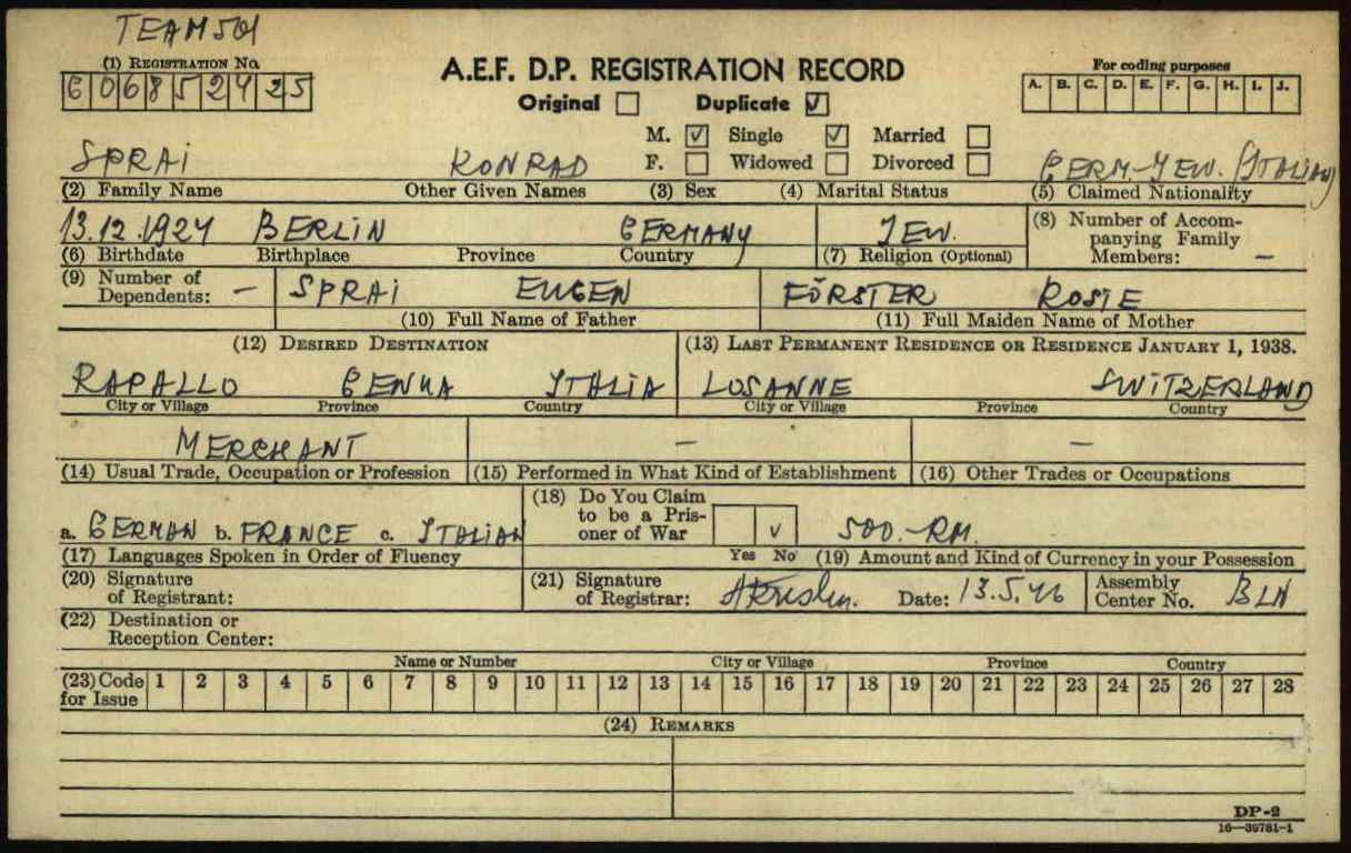 Wahrscheinlich führten familieninterne Gründe zu der Unterbringung in der Schweiz. Im Gespräch mit Sibylle Einholz wurde deutlich, dass die Kosten für das Internat durch die Erbschaft einer Tante väterlicherseits übernommen wurden. Zugleich deutet einiges darauf hin, dass Konrad W. Sprai nach der erneuten Heirat seiner Mutter Rosie Förster in ein familiäres Spannungsverhältnis geriet. Ob das Kind aus einer früheren Verbindung in der neuen Ehe schlicht als Belastung empfunden wurde oder ob der Stiefvater konkrete Vorbehalte hegte, möglicherweise auch wegen Konrad W. Sprais jüdischer Herkunft, lässt sich nicht abschließend klären. Seine Kindheit verbrachte Konrad W. Sprai bis 1936 oder 1937 im Schweizer Internat. Auf seiner Registrierungskarte als Displaced Person vermerkte Konrad W. Sprai nach dem Zweiten Weltkrieg Lausanne sogar als letzten dauerhaften Aufenthaltsort.