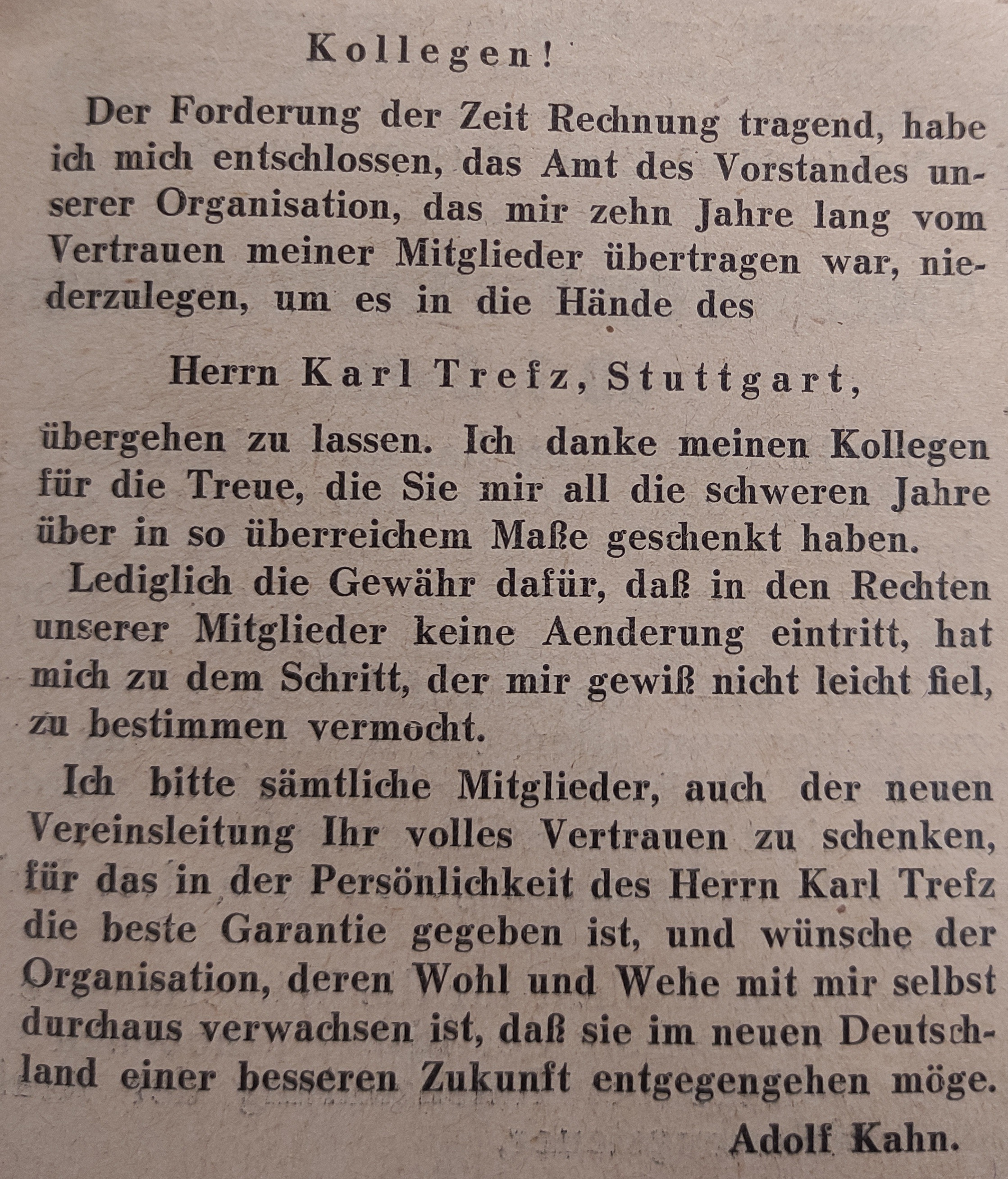 Nach der Machtübertragung an Adolf Hitler am 30. Januar 1933 und den Reichstagswahlen vom 05. März 1933 wurde der Verein württembergischer und hohenzollerischer Viehhändler zügig und konsequent arisiert. Sämtliche jüdische Viehhändler wurden aus ihren Posten gedrängt. Auch Adolf Kahn musste seine Arbeit gezwungenermaßen aufgeben. In der Ausgabe der Süddeutschen Viehhandels-Zeitung vom 31. März 1933 erklärte er öffentlich seinen Rücktritt mit folgenden Worten: