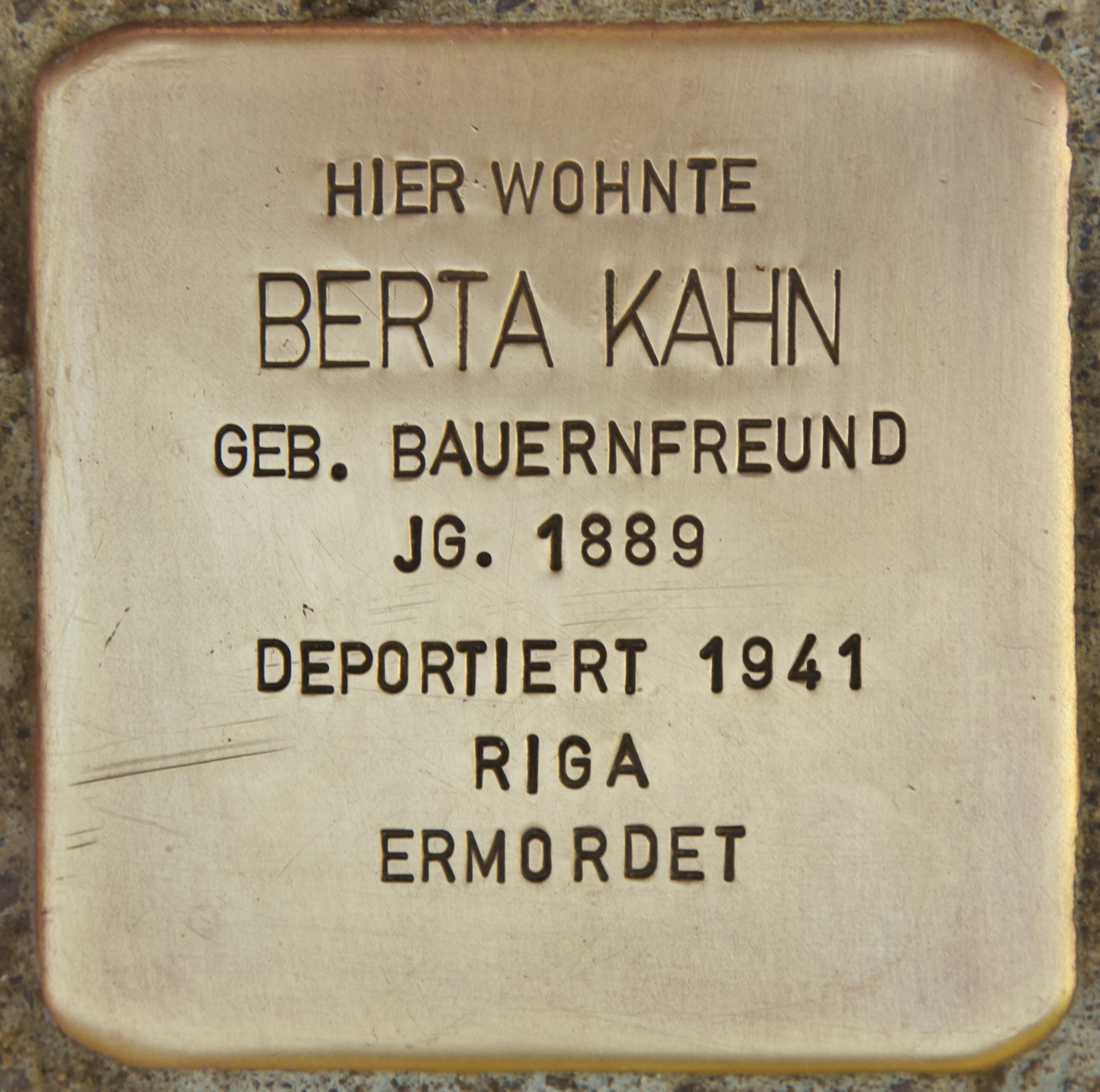 Nach dem Ende des Zweiten Weltkrieges und dem Zusammenbruch der nationalsozialistischen Diktatur versuchte Hans Max aus Südafrika Auskunft über den Verbleib seiner Mutter zu erhalten. Zu diesem Zweck stellte er am 11. Juni 1945 eine Suchanfrage an das Rote Kreuz. Dem Formular fügte er eine Nachricht für seine Mutter bei: „Am fit and well. Hoping to hear good news from you soon. Will if possible come and see you. Fondest love your son Hans.“ Ob auch Berta Kahn im Wald von Bikernieki ermordet wurde, konnte nie abschließend geklärt werden. Nach der Deportation am 1. Dezember 1941 gibt es keine Nachricht mehr von ihr. Auf Antrag ihres Bruders Ludwig Bauernfreund, der inzwischen in Tel Aviv lebte, wurde sie am 19. April 1953 durch das Amtsgericht Stuttgart für tot erklärt.