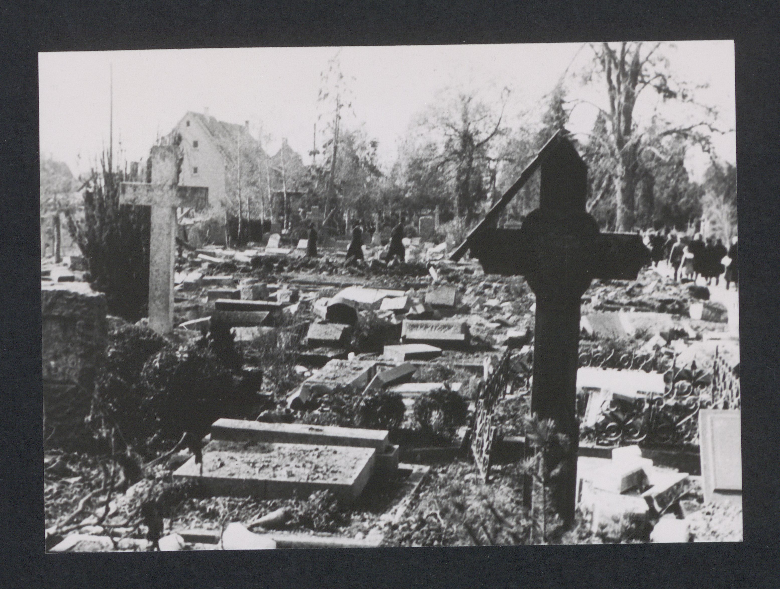 Die Kriegszerstörung ist nicht auf die mittelalterliche Altstadt Böblingens beschränkt. Weite Teile der Stadt sind durch Bomben beschädigt, auch der Alte Friedhof, der sich damals noch am Stadtrand befand, übersteht den Zweiten Weltkrieg nicht ohne Schäden (Bild: Stadtarchiv Böblingen).