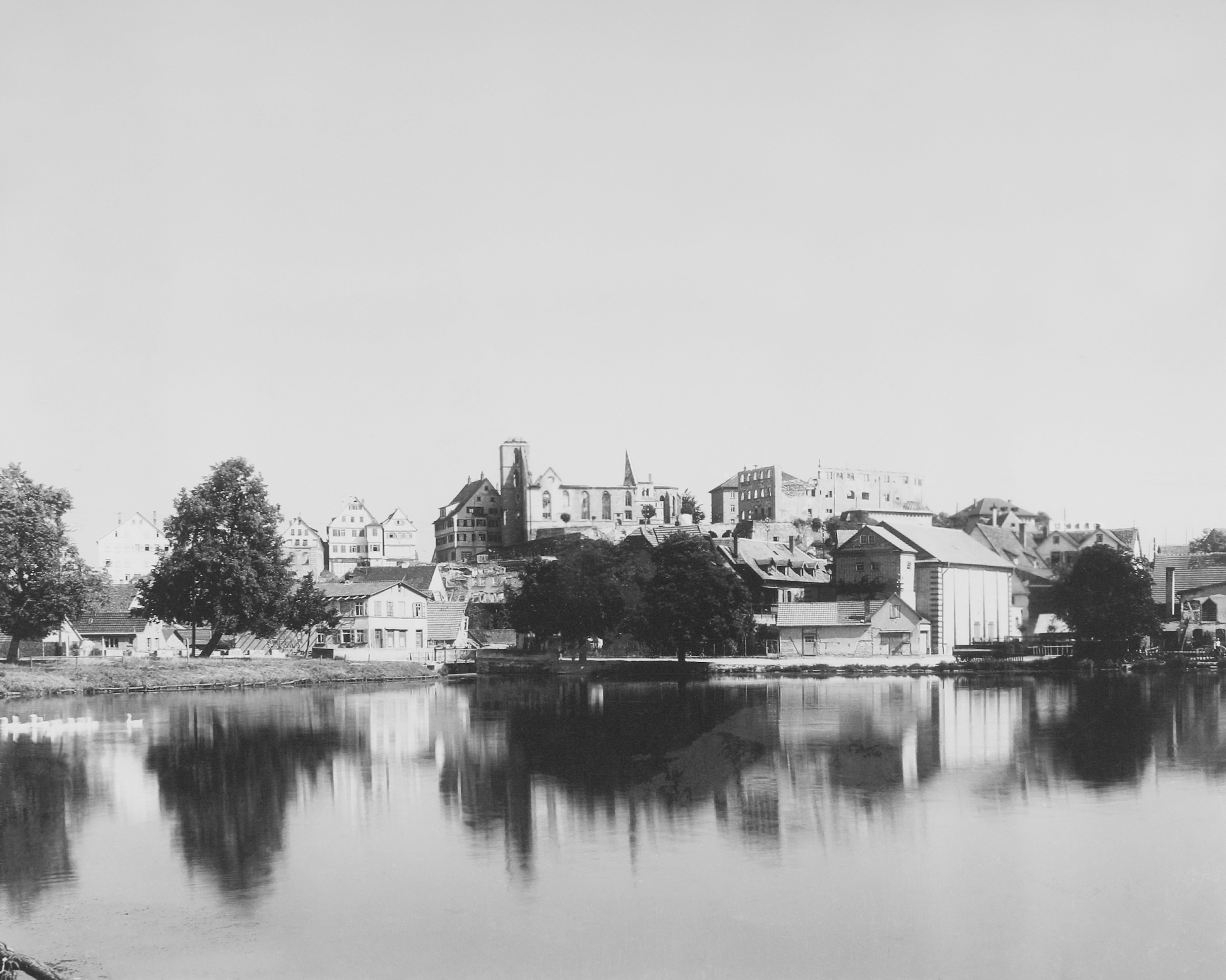 Die Aufnahme zeigt die Böblinger Stadtsilhouette, damals auch „Partie über den See“ genannt. Im Wasser spiegeln sich von links nach rechts das historische Rathaus mit seinem Glockenturm, die markante Stadtkirche und der prächtige Seitenflügel des noch bestehenden Böblinger Schlosses. Mittig vor der Kirche befindet sich eines der ältesten, heute noch bestehenden Häuser Böblingens an der Poststraße (Bild: Stadtarchiv Böblingen).