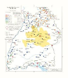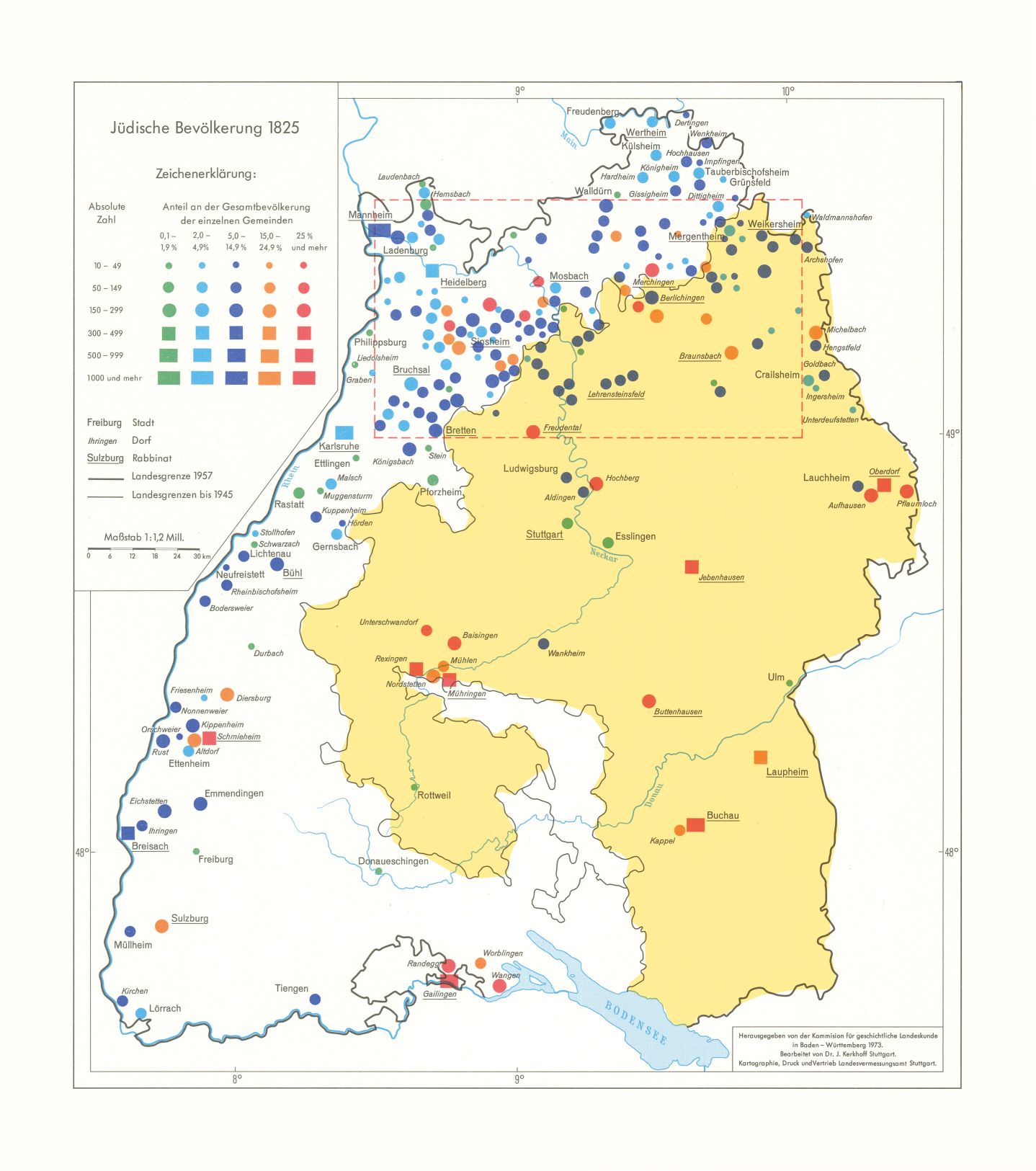 Quelle: Jüdische Niederlassungen im Mittelalter und Jüdische Bevölkerung 1825, in: Historischer Atlas von Baden-Württemberg, Stuttgart 1972. Geobasisdaten © LGL, www.lgl-bw.de. Die Markierungen stellen schemenhaft den Herrschaftsraum des Herzogtums bzw. des Königreichs Württemberg dar.