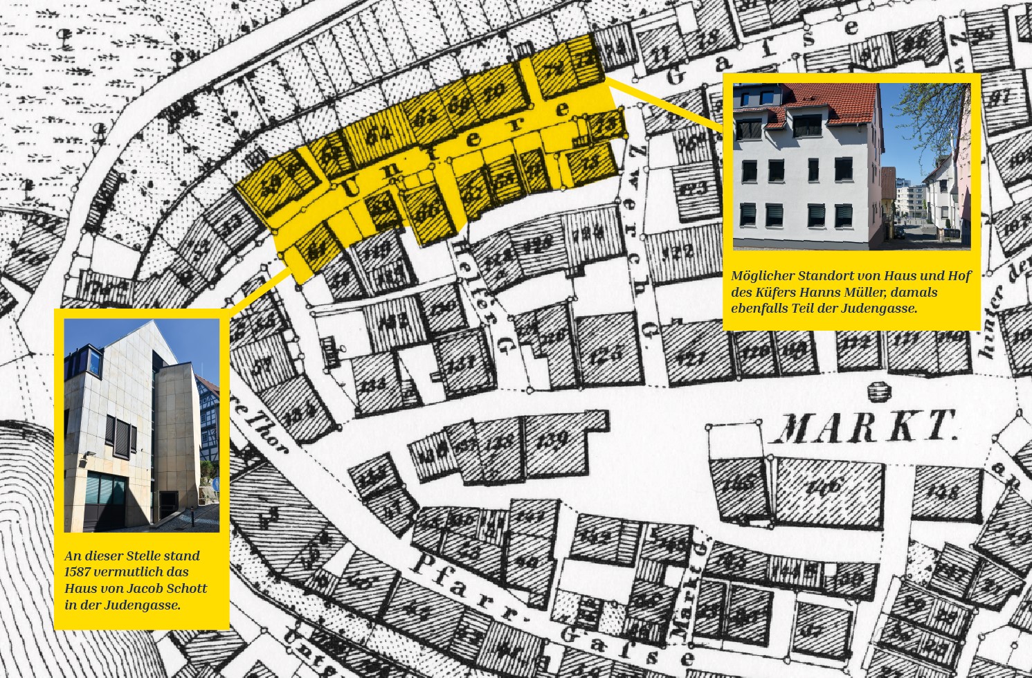 Außerdem nennt das Lagerbuch von 1587 konkret zwei Häuser, die sich in der Judengasse befanden. Ihre genaue Lage lässt sich nicht mehr zweifelsfrei bestimmen. Es spricht viel dafür, dass sie den westlichen Teil der Unteren Gasse zwischen dem heutigen Torgässle und dem Marktgäßle begrenzten.